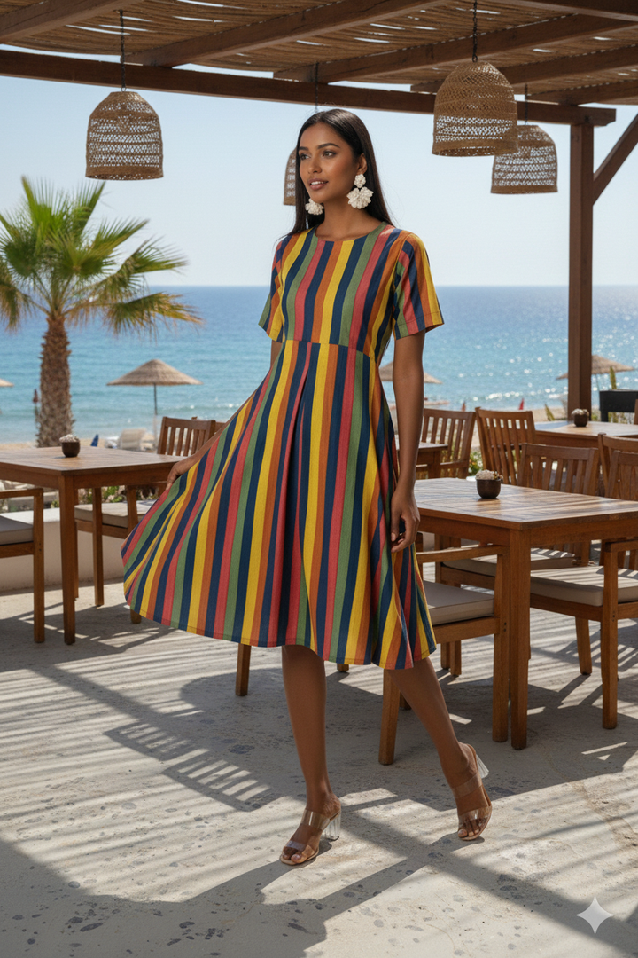 Twirl into joy with our Rainbow Stripes Fit n Flare Dress! This playful piece features a bias-cut flare with a dazzling mix of vertical and diagonal colorful stripes. Versatile enough for daytime adventures or evening escapades, it's your go-to fashion companion. Cinch with a belt and sprinkle on accessories for an extra dash of fabulousness!