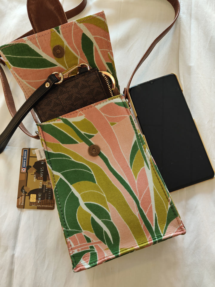 A handy and stylish sling bag to keep your mobile and money in place. Made out of pretty fabrics, this sling has a dedicated space to keep your mobile and can accomodate keys, cards and cash as well. Easy to carry when you're stepping out shopping and need to carry just the basics.
