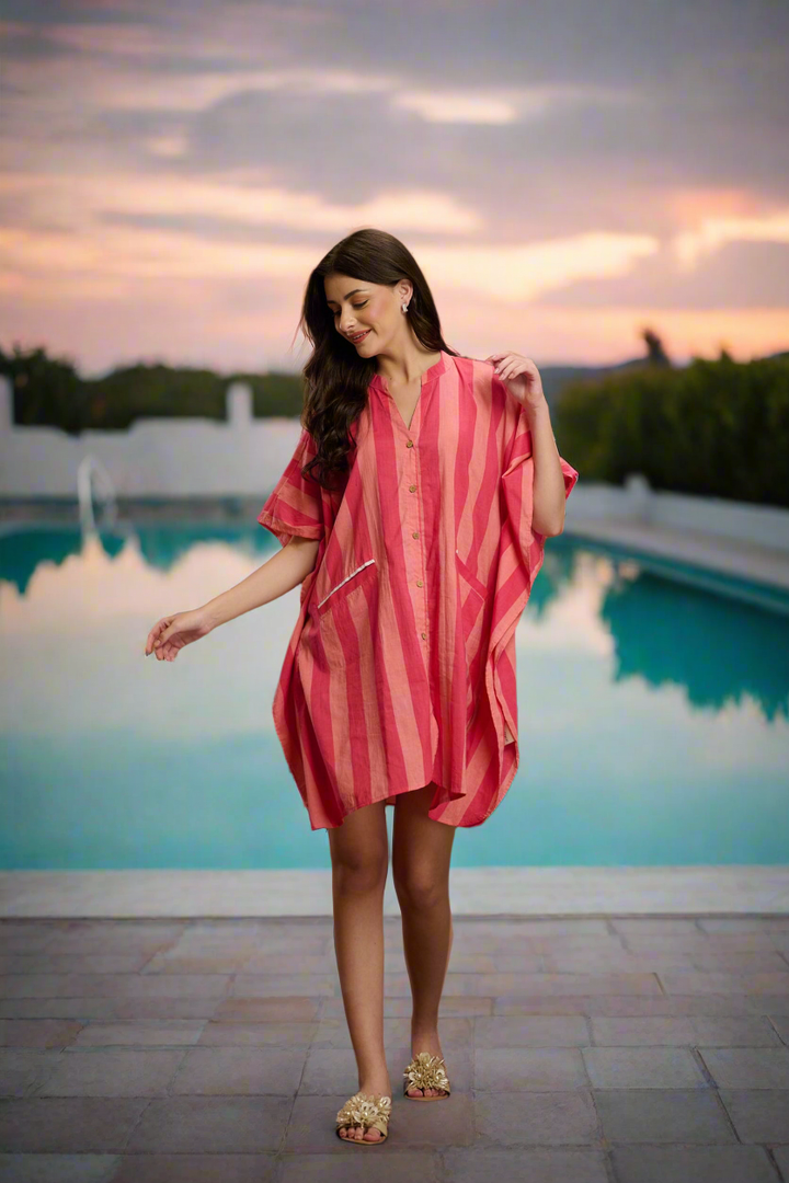 Enjoy easy, breezy comfort with our Cotton Candy Stripe Kaftan Shirt. Made from lightweight cotton, this cheerful piece doubles as a dress or tunic. Perfect for sunny adventures, its vibrant stripes add a splash of fun to your day.