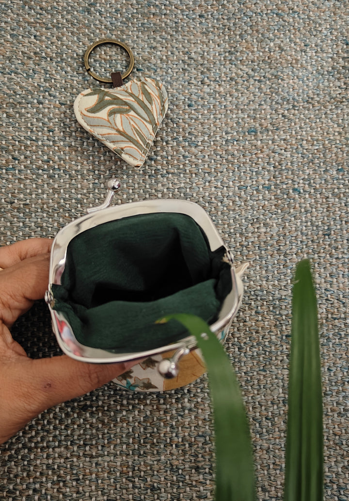 This Frame Pouch and keychain offers a refined way to keep your coins and jewelry elegantly organized. Featuring a sleek silver frame, this compact pouch combines sophistication with practicality, adding a subtle touch of style to your essentials. Perfect for everyday use or quick outings, it ensures your small valuables are secure and easily accessible.