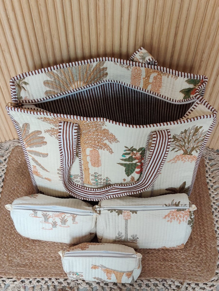 Cream Palm Tote with Set of 3 Matching Toiletry Pouches