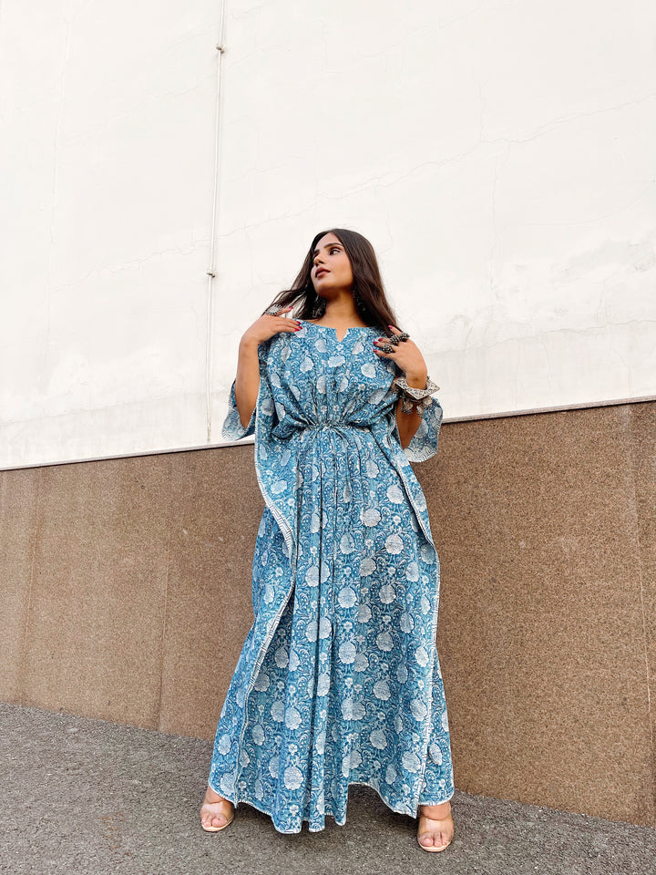 Wear it as nightwear, resort wear, at poolside, or just as relaxing day wear. This free-size flowy Kaftan is crafted in soft cotton fabric and the convenient drawstring detailing adds an element of comfort.