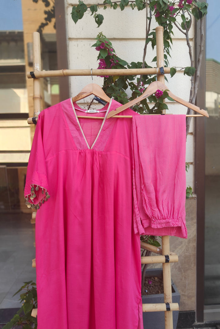 This vibrant hot pink kaftan kurta flows effortlessly paired with striped pants for the perfect playful look. Featuring pink stripes along the hem and charming gold bead accents on the sleeves, it’s a fun and festive outfit that easily shifts from casual dinners to lively evening get-togethers—just swap your accessories and you’re ready to shine!