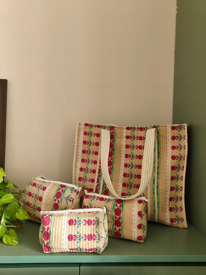 Indie Floral Beige Tote & Set of 3 Toiletry Pouches