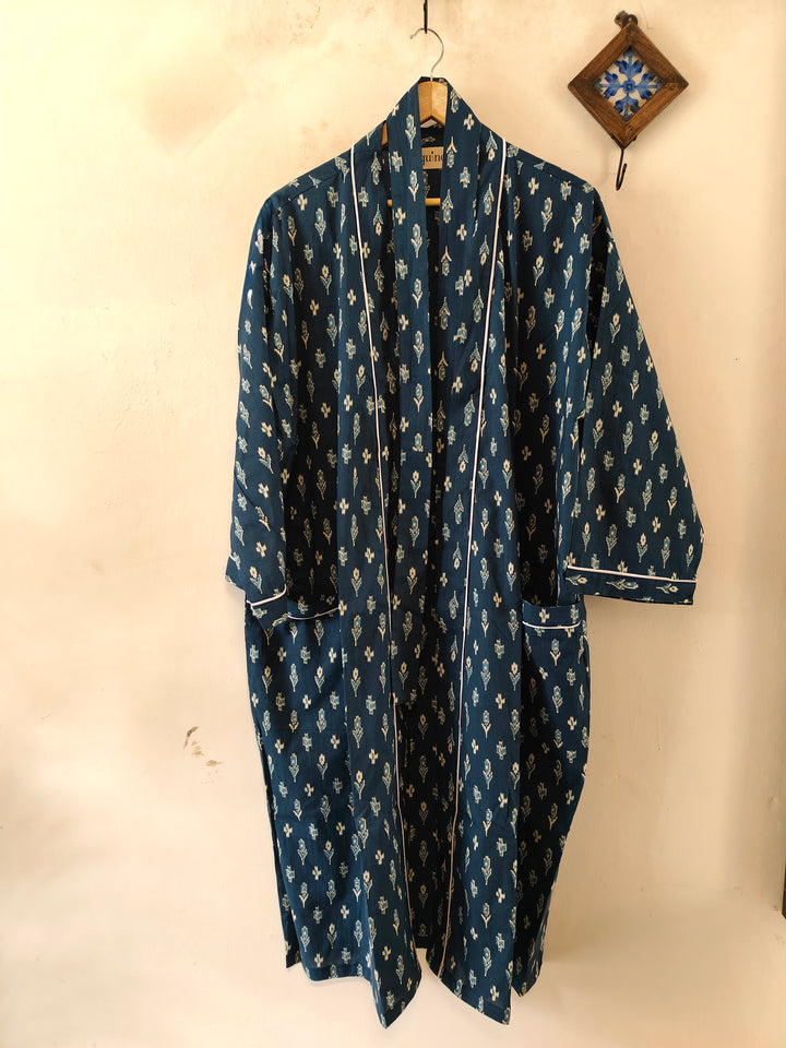 Our light weight block printed robes/housecoats are perfect for lounging around the home or spa. Use the robe as a cover up on the beach or at home before & after the shower or for your makeup and hair sessions.