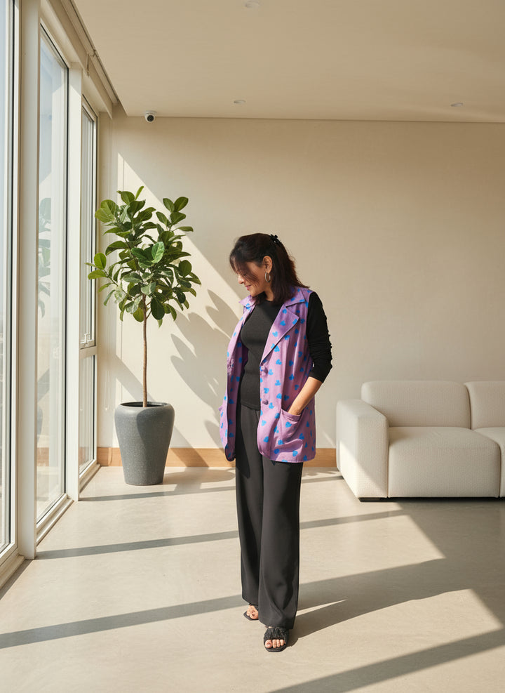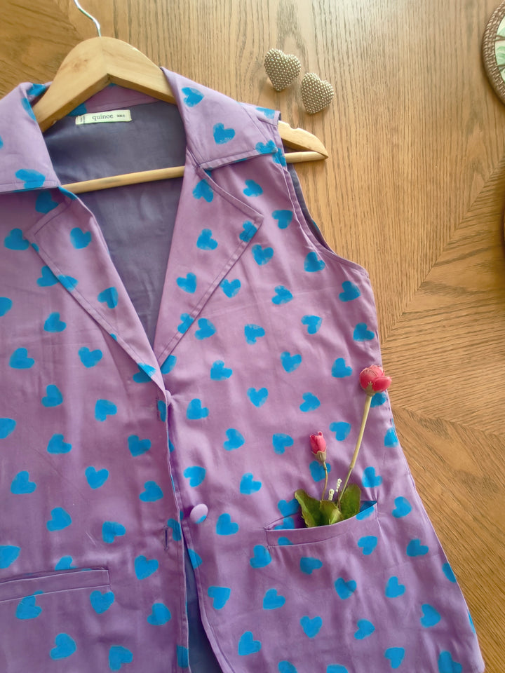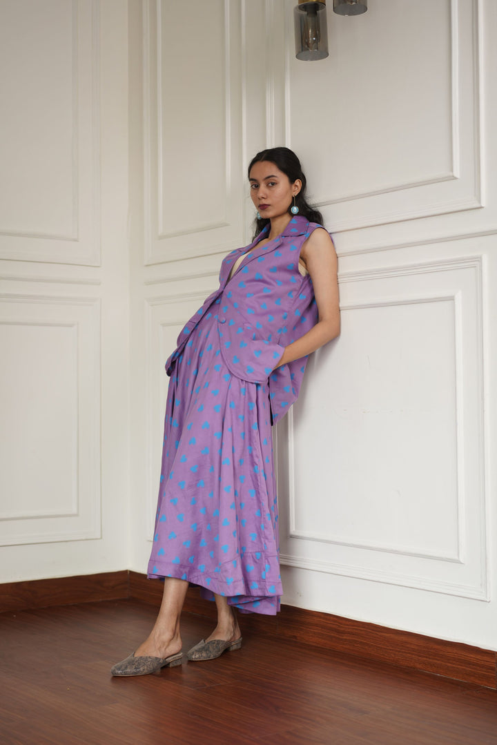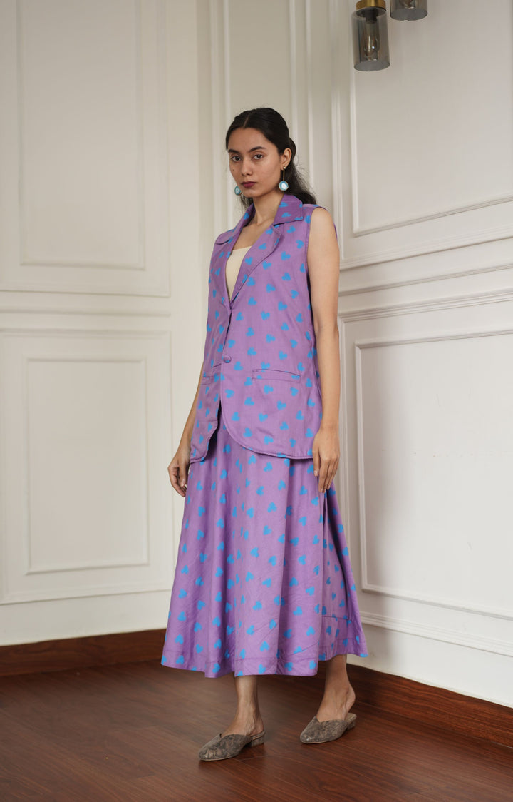 Embrace effortless elegance with this enchanting lavender coord set featuring a double-breasted waistcoat and matching A-line skirt. Crafted from luxurious cotton twill, this ensemble boasts a refined spearpoint collar adorned with whimsical blue hearts that add a touch of romance. The tailored silhouette delivers a flattering fit without compromising on comfort, making it the perfect layering companion for year-round styling. Whether you're dressing up for brunch or keeping it casual, this versatile two-piece transitions beautifully across seasons and occasions. A playful yet sophisticated addition to your wardrobe that proves style and charm go hand in hand.