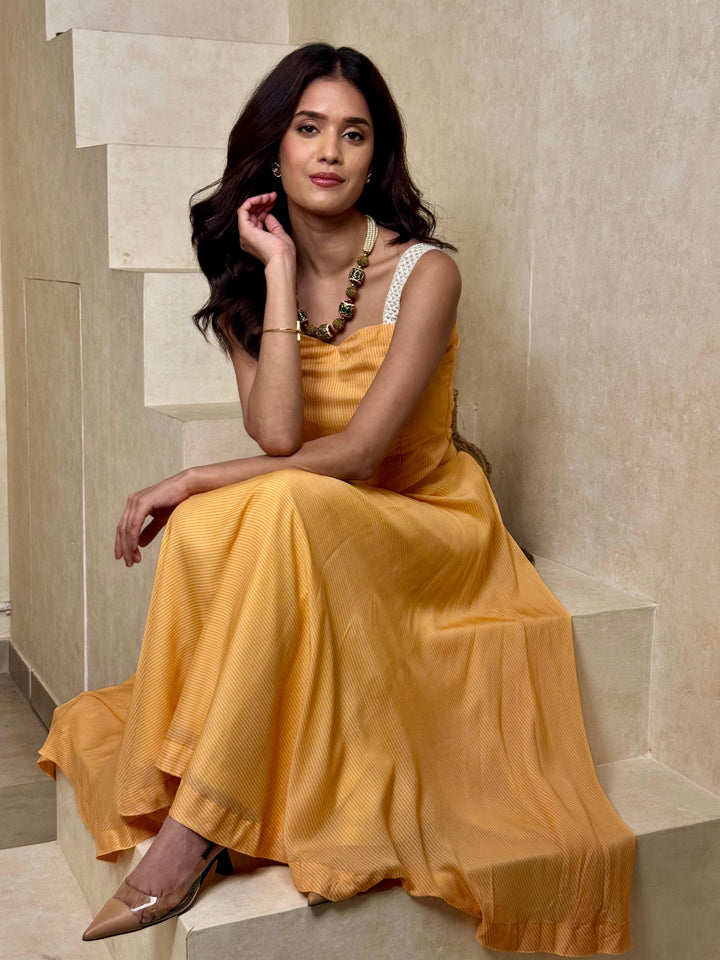 This classic yellow striped skirt set highlights a bias cut and is decorated with geometric pink and green motifs. Fully lined for enhanced comfort, it includes functional pockets on both sides. Complemented by a chic corset-style crop top featuring pearl lace straps and a side zipper, this ensemble exudes elegance and sophistication.