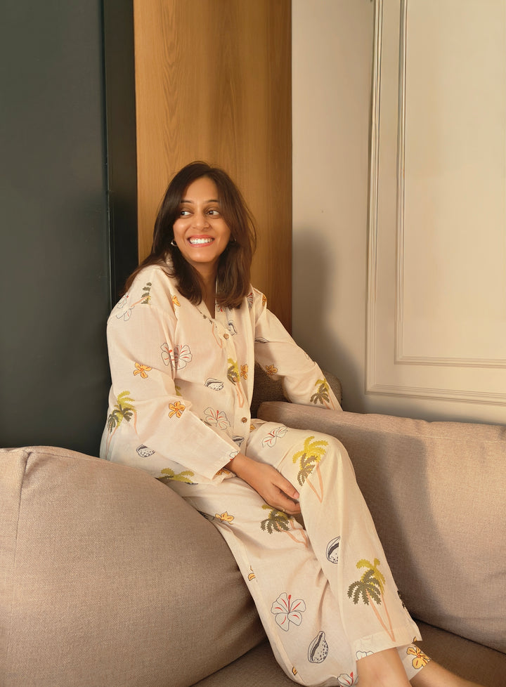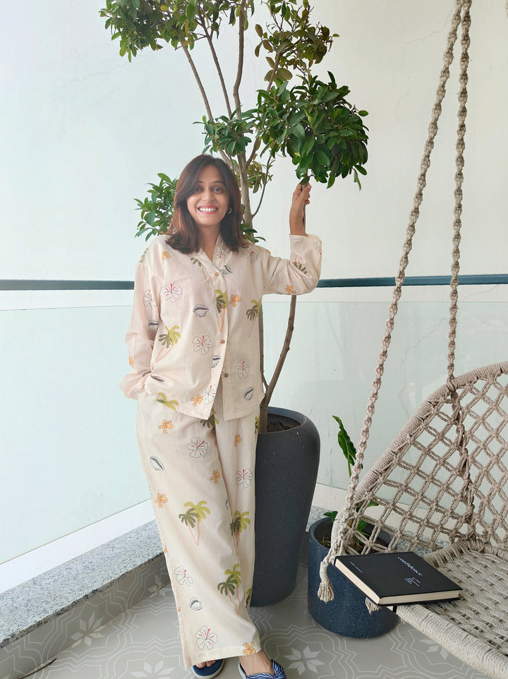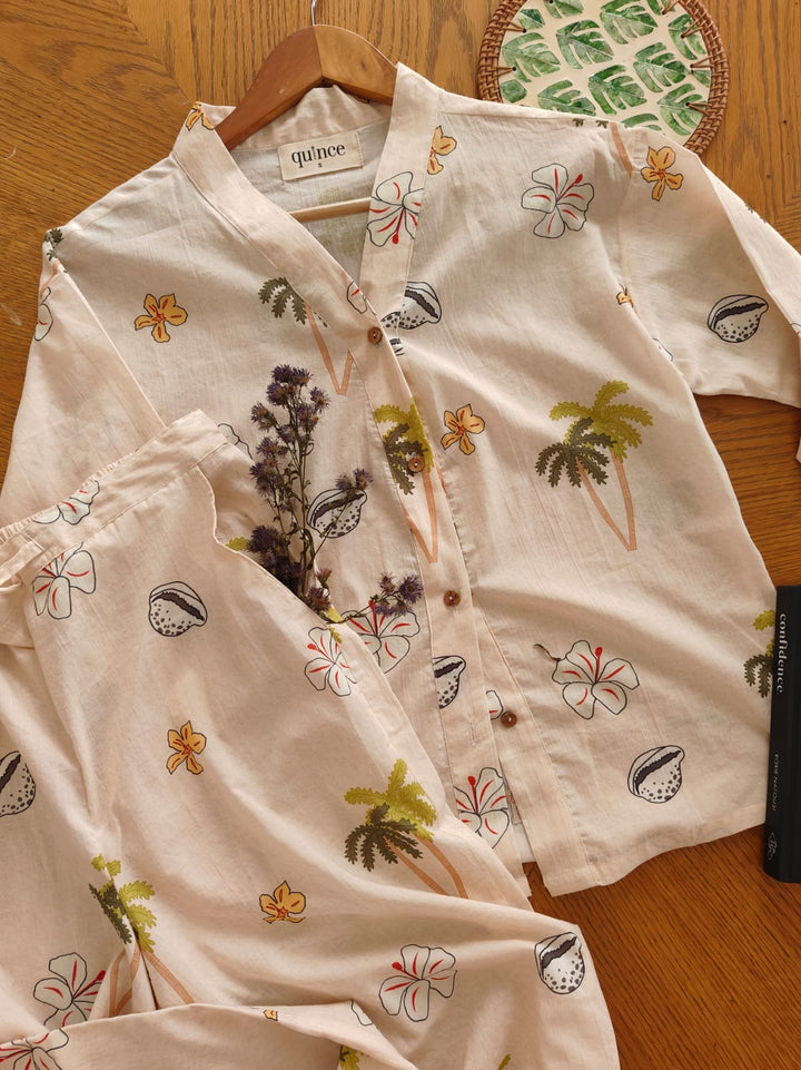 Slip into vacation mode every night with the Beach Walk Pajama Set, crafted from ultra-soft 100% cotton. Lightweight, breathable, and silky against the skin, this set is designed for ultimate comfort with a touch of resort-style luxury. Featuring a relaxed button-up top and drawstring bottoms, its tropical-inspired print of hibiscus flowers, palm trees, and seashells brings breezy island vibes straight to your lounge or getaway wardrobe.