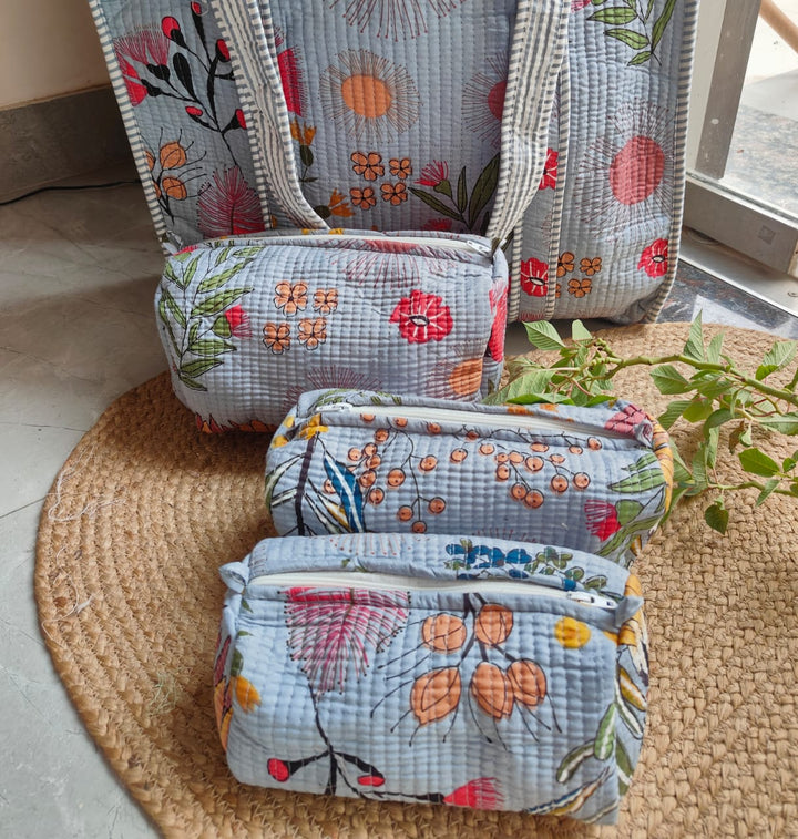 Misty Grey Meadows Tote with Matching Set of 3 Toiltery Pouches