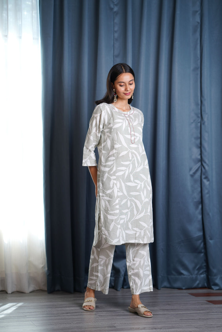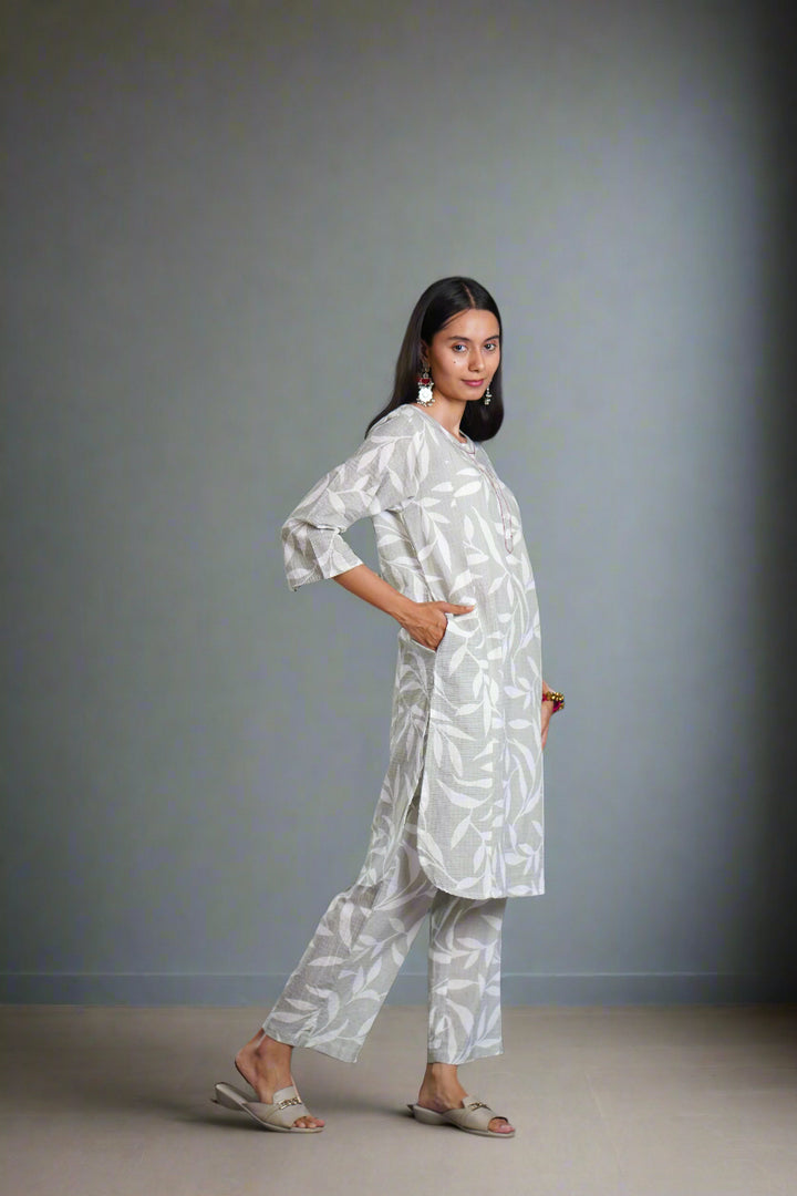 This kurta set is designed to suit any day and mood, seamlessly transitioning from morning to evening. Crafted from 100% cotton, it features an elegant print of delicate white leaves, offering a refined and feminine touch.