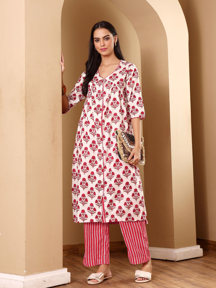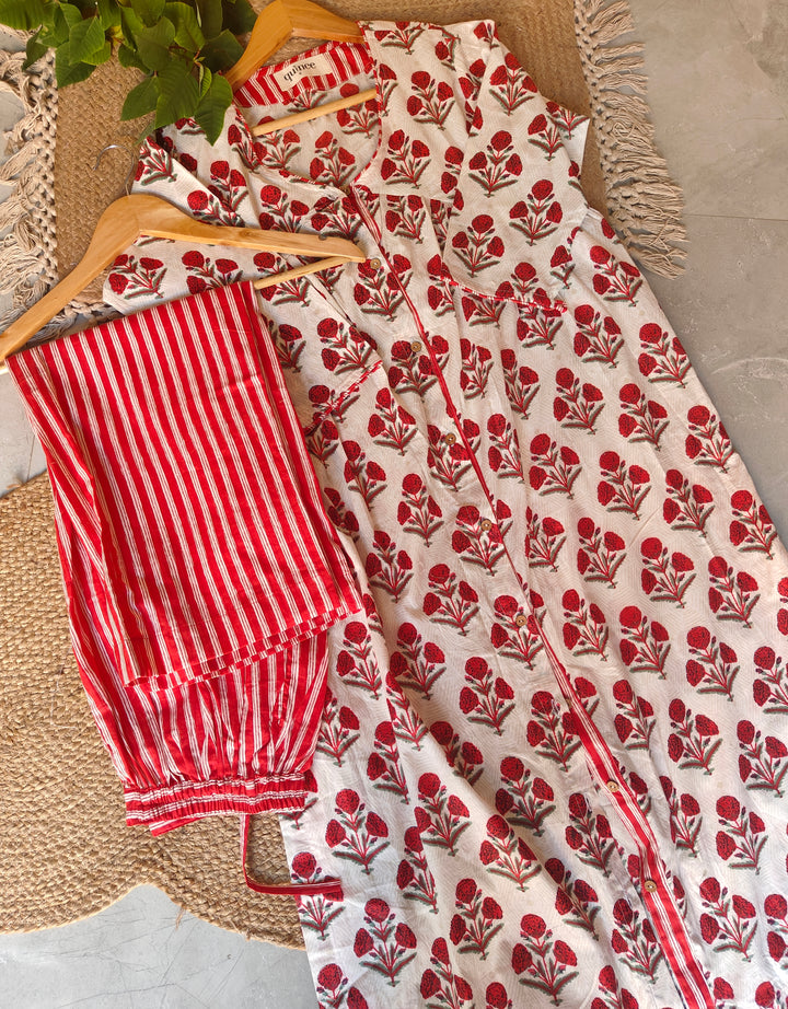 This charming and comfortable kurta set features a red poppies base . The kurta has a relaxed, A-line silhouette with a pleated front and three-quarter sleeves, offering both style and ease of wear. It is paired with coordinated straight-fit matching pants, creating a harmonious and playful ethnic ensemble. This outfit is perfect for casual outings, work-from-home days, or laid-back festive gatherings.