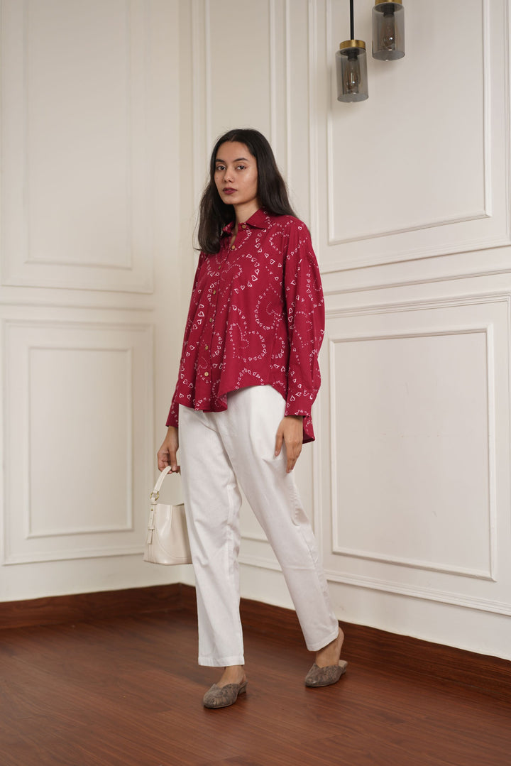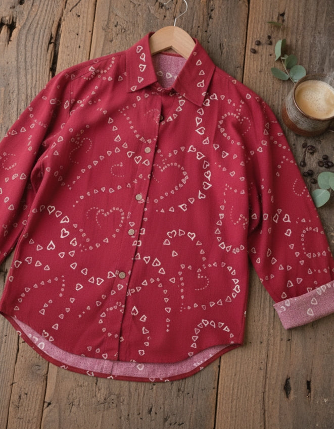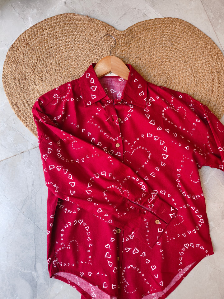 Wrap yourself in cozy charm with this deep red flannel shirt, adorned with delicate heart prints that add a touch of romance to your winter wardrobe. Perfect for layering under your favorite jacket or throwing over a woolen for instant warmth and style. Whether you're dashing to the airport or dashing someone's heart, this playful piece keeps you snug while turning heads. A winter essential that's equal parts comfort and character..