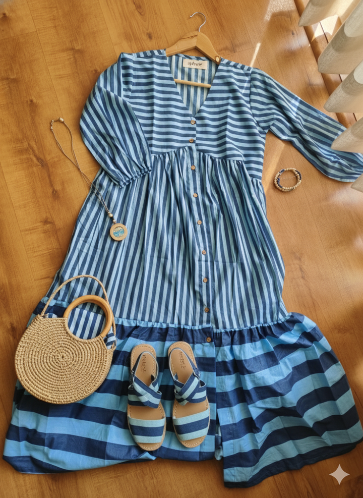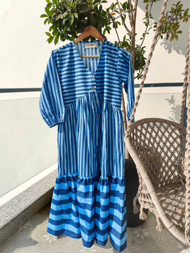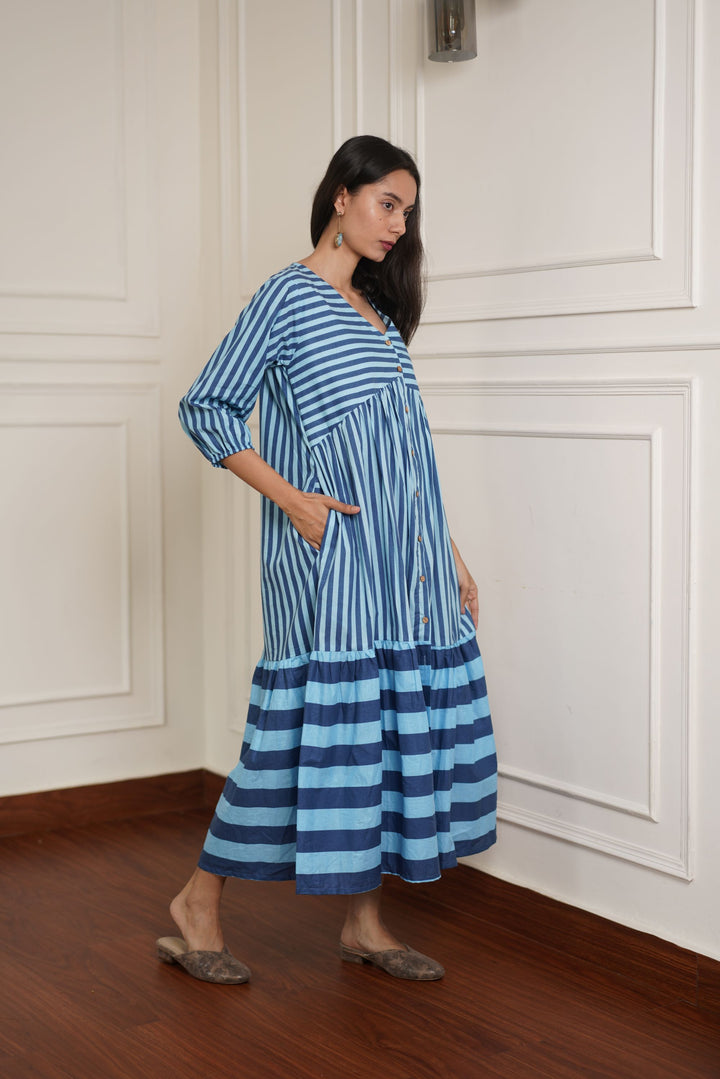 Strut your stuff in this striped sensation that plays with contrasting blue tones for maximum visual interest. The fitted bodice hugs you just right before flowing into a graceful flare that flatters every frame. Whether you're heading to brunch, a casual date, or just want to feel fabulous running errands, this easy-going dress is your new go-to companion. Timeless stripes never go out of style—and neither does looking this good.