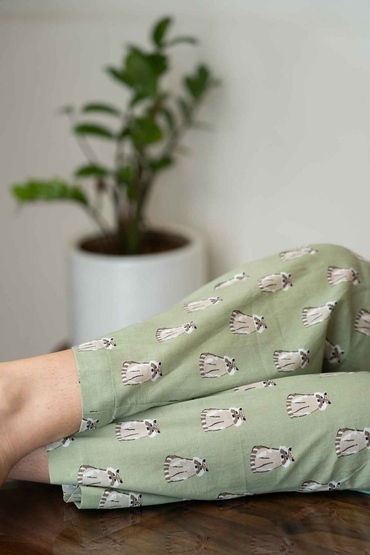 Cozy up like in a cocoon in this cutest racoon print pajama set in sage green base color. Comes with a blackout eye mask to help you sleep even better.