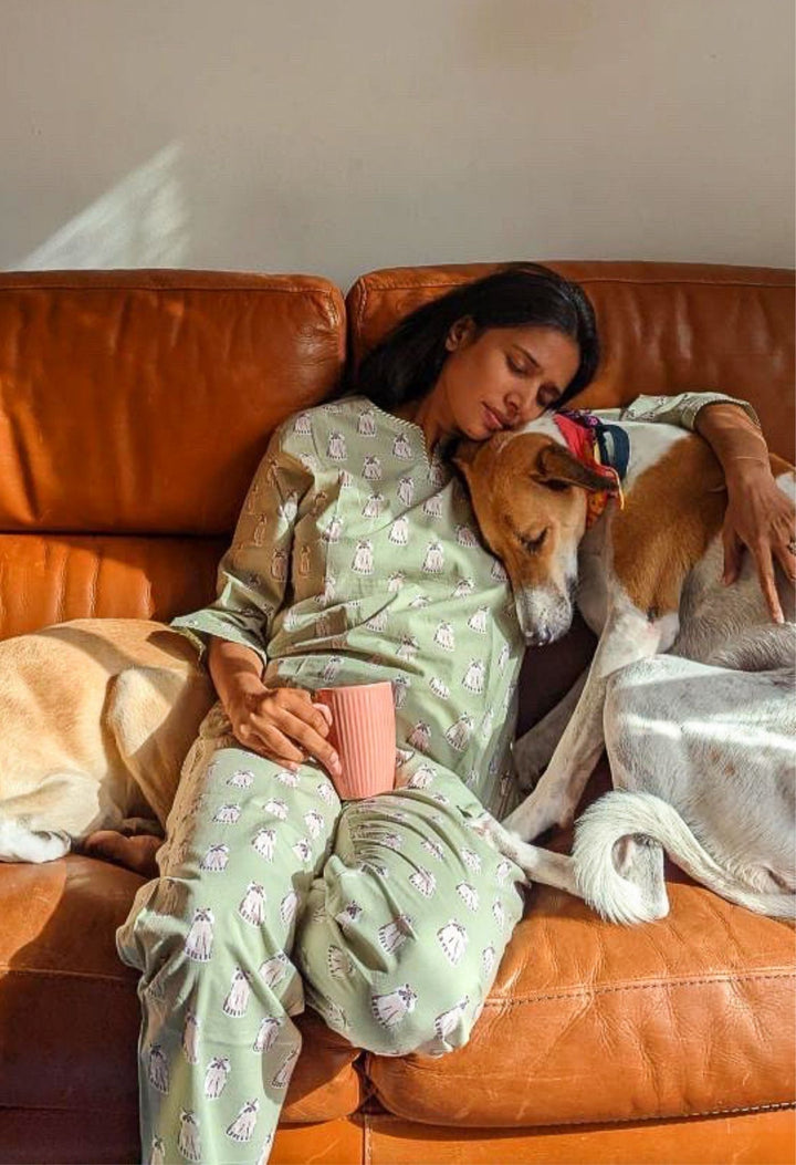 Our new pajama sets are made in luxurious cotton fabrics, enveloped with charming hand block-printed and screen print pattern . Top and bottom are both cut generously for easy comfort. Pants have a soft elastic and drawstring at waist. Fabric gets softer with every wash. Wear for a goodnight sleep, or all day at home for lounging.