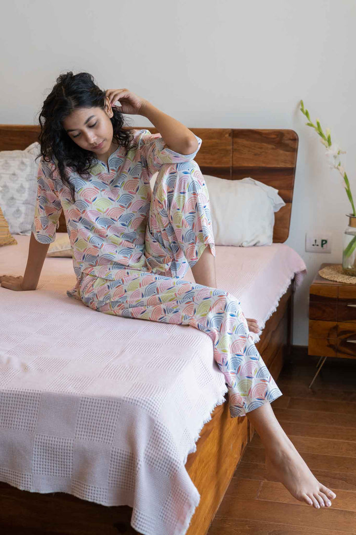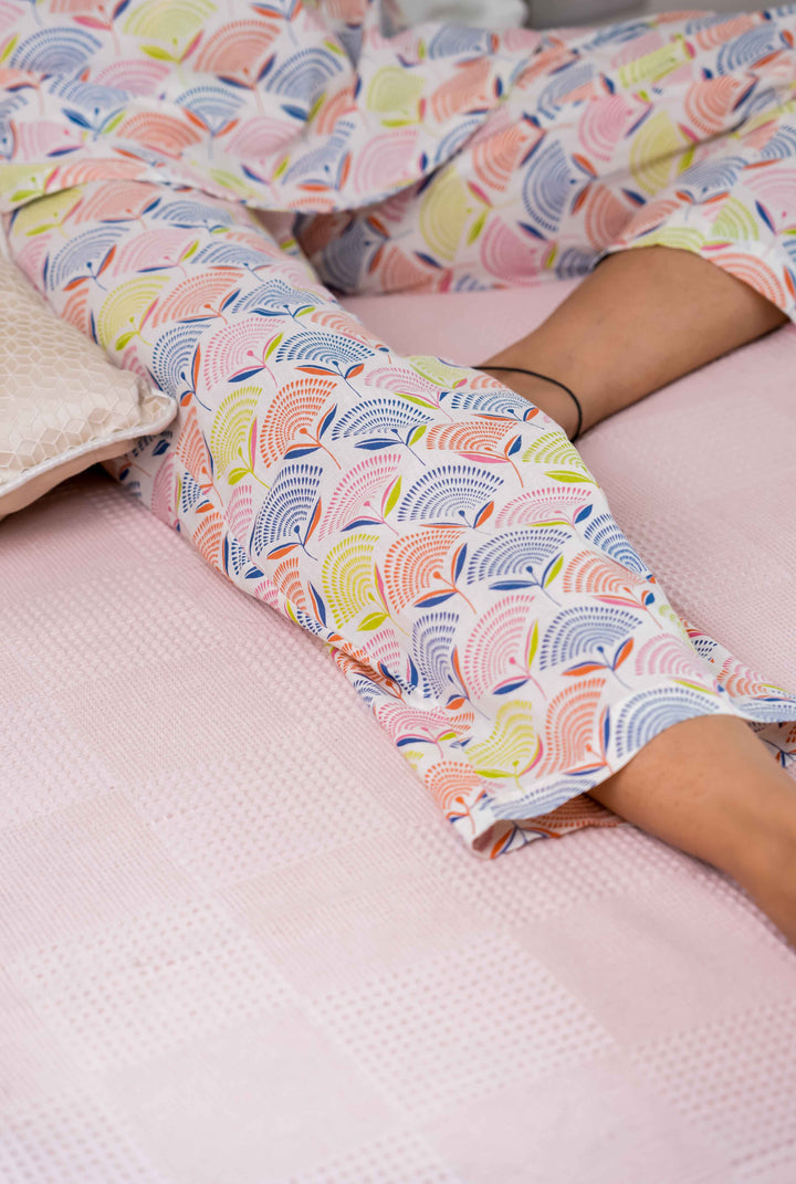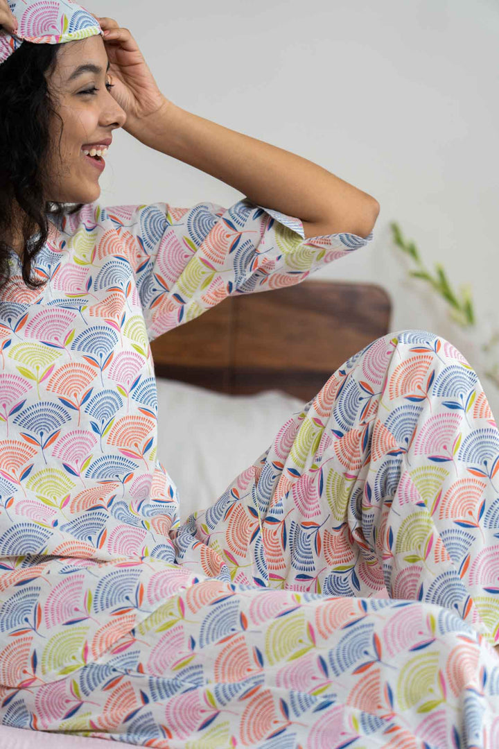 Our new pajama sets are made in a luxurious cotton fabrics, enveloped with charming hand block-printed and screen print pattern . Top and bottom are both cut generously for easy comfort. Pants have a soft elastic and drawstring at waist. Fabric gets softer with every wash. Wear for a goodnight sleep, or all day at home for lounging. Comes with a blackout eye mask to help you sleep even better.