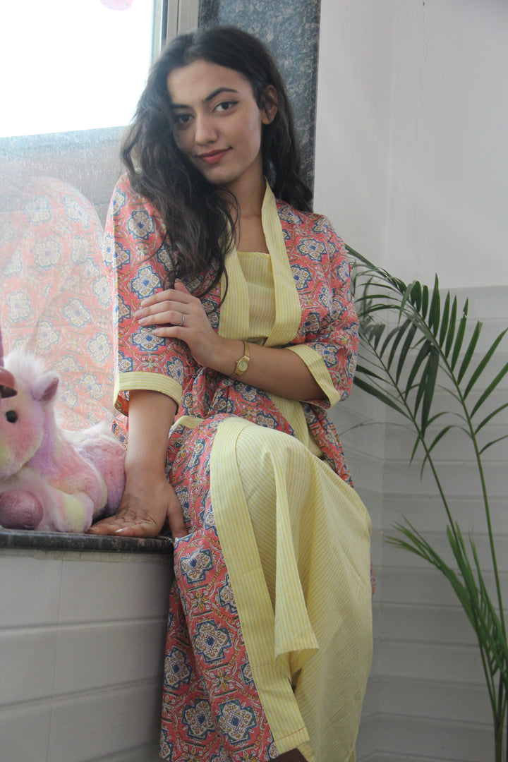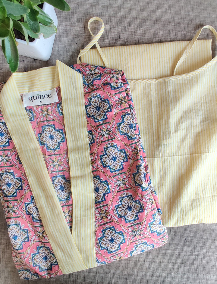 Available in two gorgeous color combinations- Sea Green Kaleidoscope print robe with mint stripes and Rose Pink Kaleidoscope print with yellow stripes.