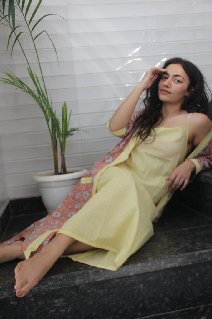 Our two piece set with a cami style dress for the night and cover up robe for the day is perfect for casual in at home or a stylish vacation. A comfortable length and relaxed fit makes it absolutely comfortable and chic loungewear. It can be worn as a set or on its own.