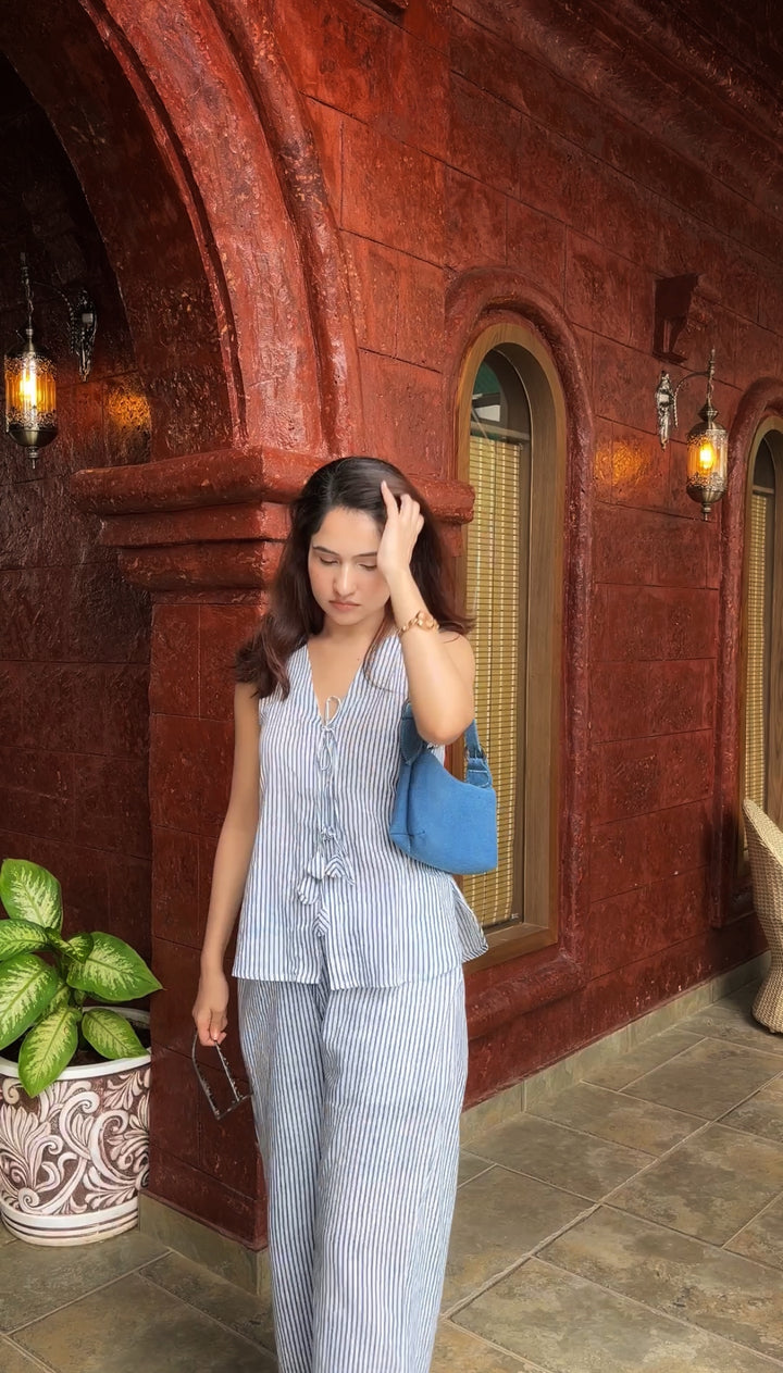 Get ready to turn heads with our fun and fabulous stripe coord set! Handblock printed on soft pure cotton mulmul, this duo features a waistcoat-style tie-up top and breezy wide-legged bottoms. It’s the perfect mix of playful charm and all-day comfort for a look that’s both stylish and easygoing.
