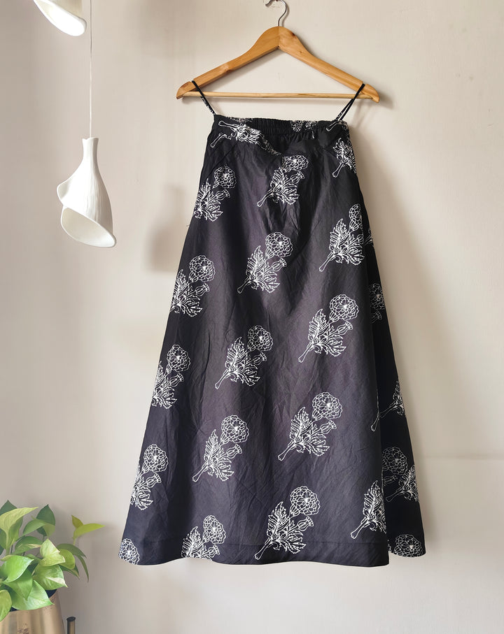 A black cotton skirt is a timeless classic. Meet our A-line midi skirt with a flared bias cut and handy pockets that add a playful swish to your steps. From dancing the night away to cozy dinners or puja rituals at home, this skirt easily switches between dressy and casual with just a change of accessories. Perfect for the modern desi spirit who enjoys blending comfort, creativity, and a dash of cultural charm.