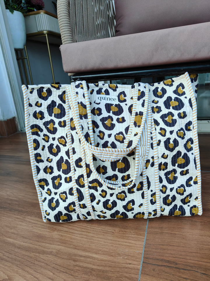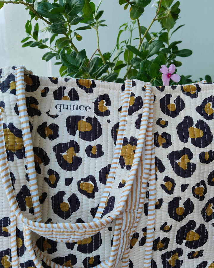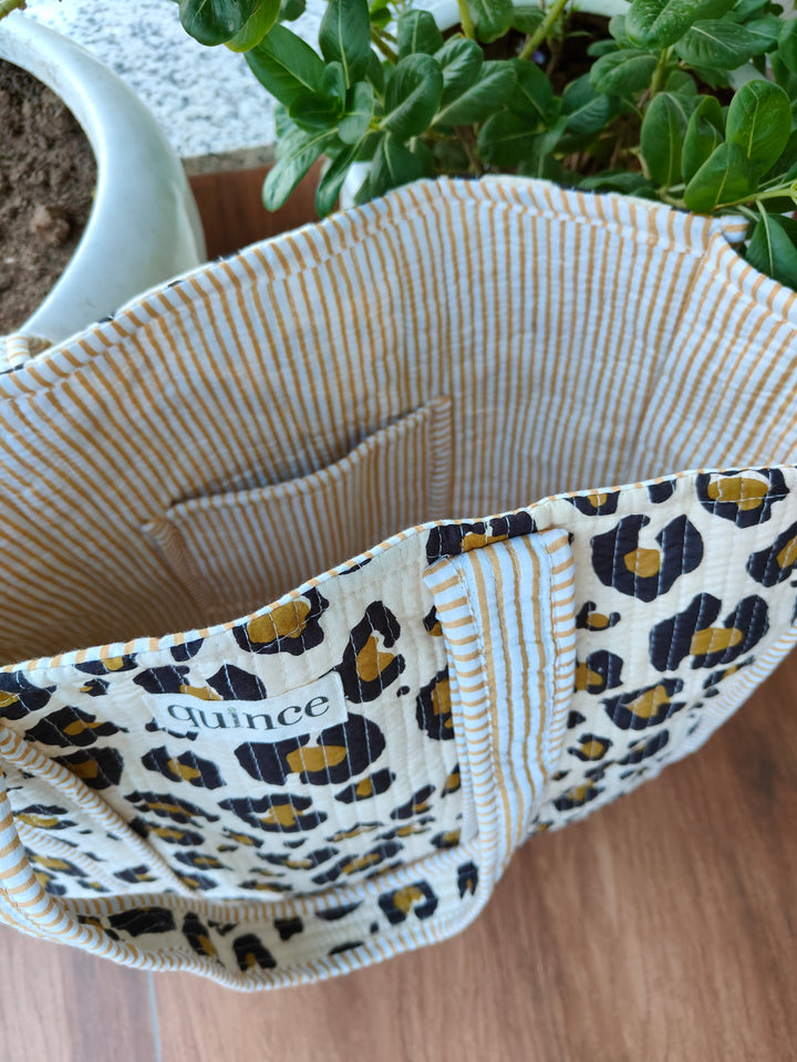 The bag is made using sustainable materials, on the outside- it's covered in cotton fabric and the lining inside is made of recycled cotton. The bag has a thick, quilted padding to give the bag shape, and to add protection to the content.