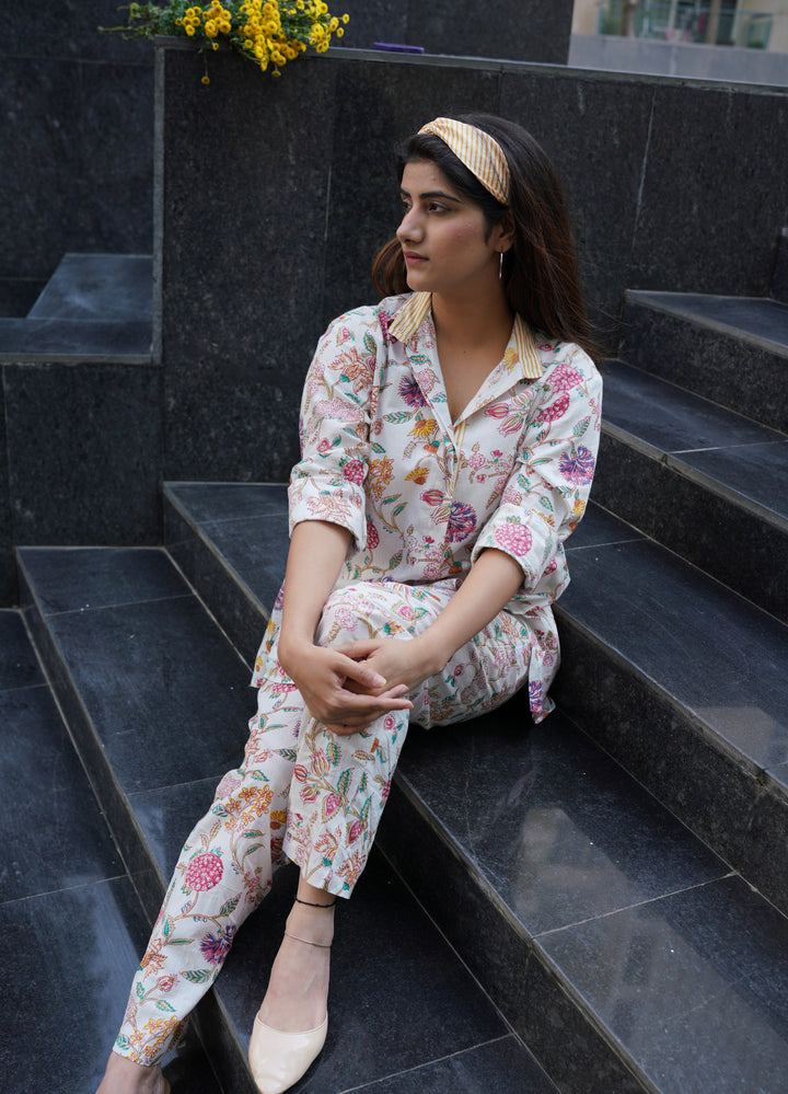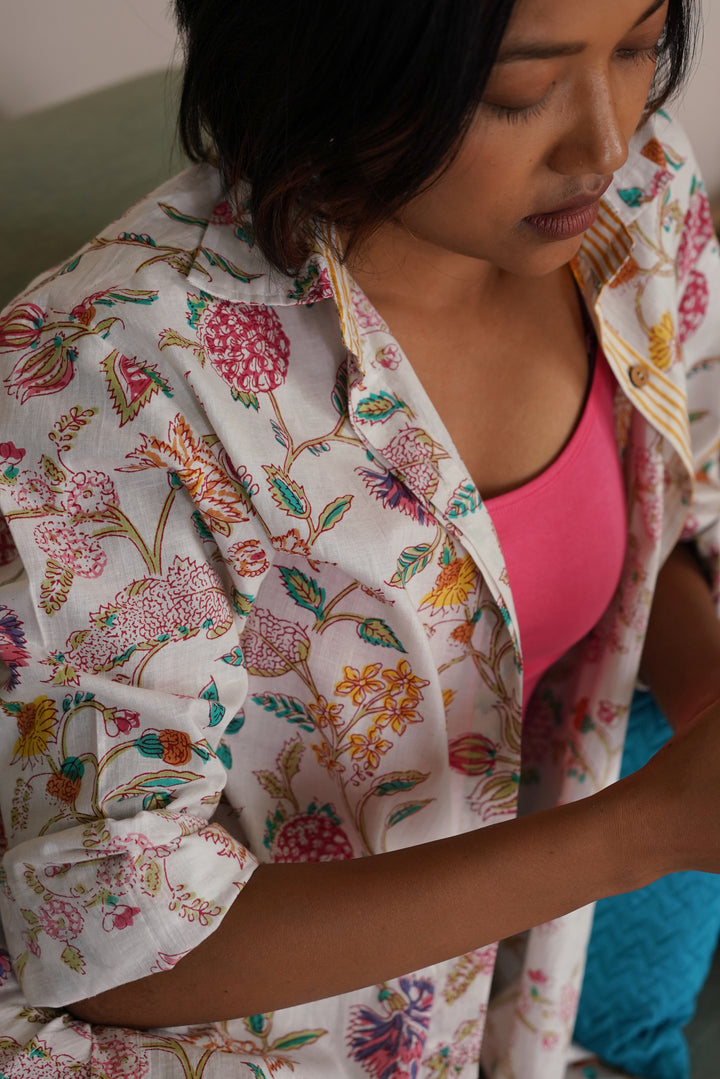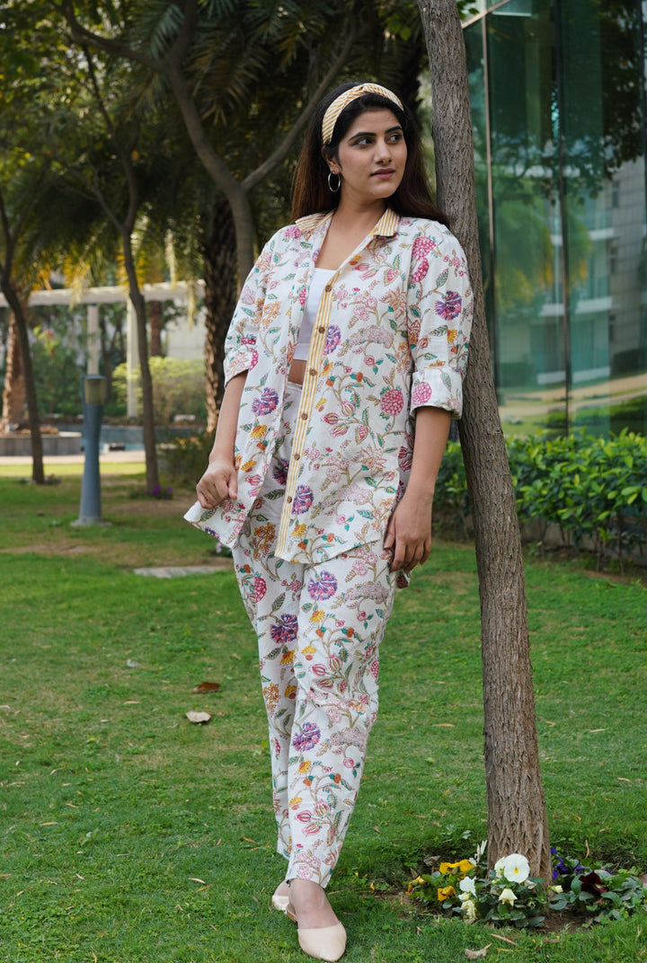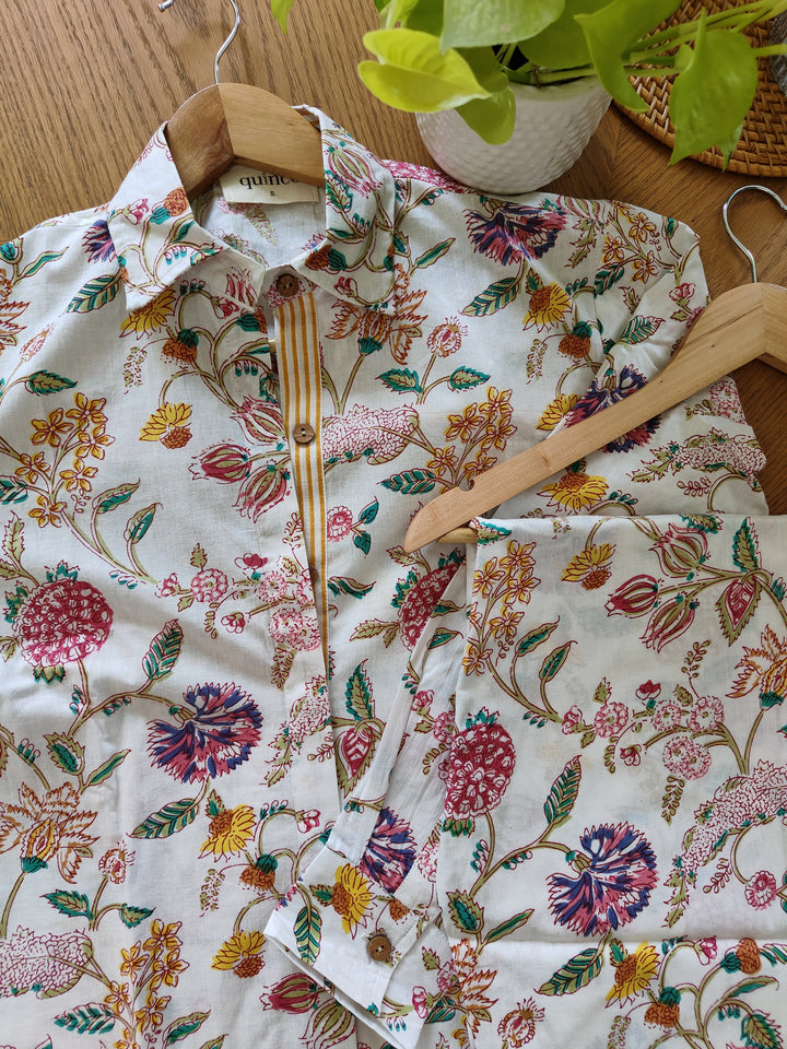 Get ready to bloom in style with our Spring in my step coord set. This set of 2 features a soothing white color adorned with exotic flowers, creating a relaxed yet playful look. Made from soft and comfortable cotton fabric, it's perfect for those sunny summer days or a tropical travel escape. The button-down style offers versatility, allowing you to wear it as a set or mix and match for endless outfit options.