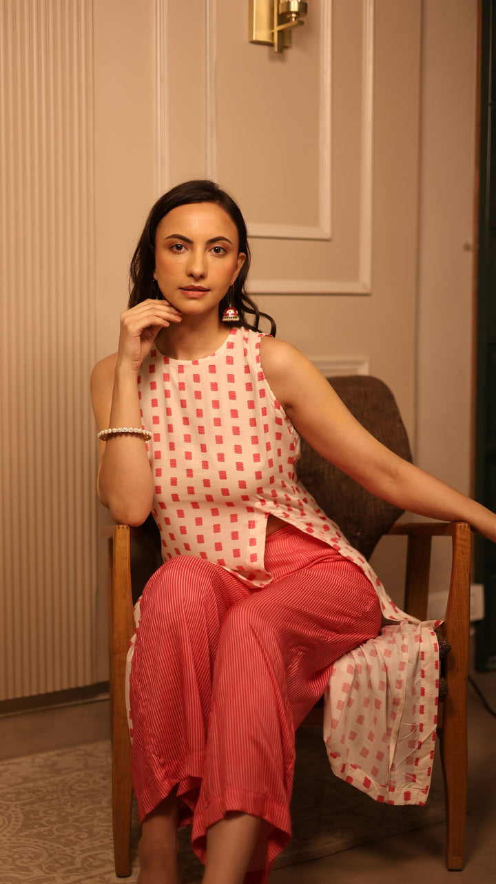 Introducing our starry nights coord set, crafted from airy modal fabric that feels smooth and flows gracefully. Light yet structured, it moves with you while maintaining a sleek silhouette. The soft cream base is dotted with delicate rose squares, creating a subtle and charming design. With a relaxed, straight fit, the vertical prints elongate your figure. A long side slit on one side of the kurta adds a stylish twist. Wear the set together for a coordinated look or mix and match to express your own playful style!