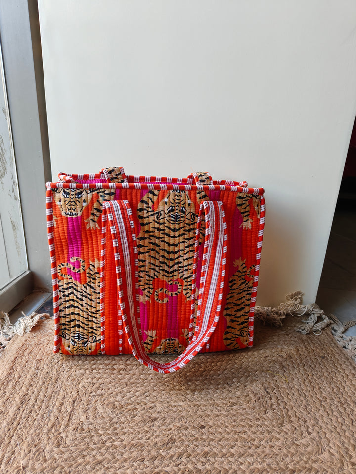 Unwind and relax in style with this charming print featuring lounging tigers in vibrant fuchsia and orange stripes. Take it to the next level by pairing it with the matching tote, making it the perfect packing companion for your next vacation at a resort.