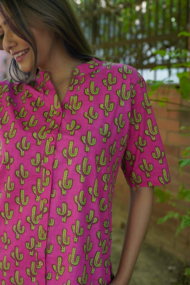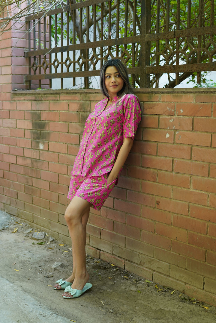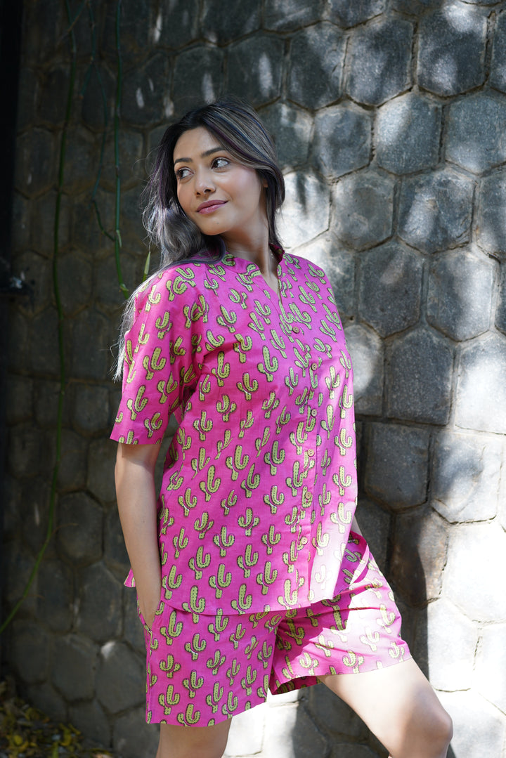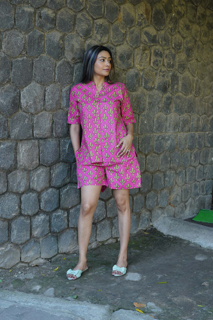 Experience the ultimate blend of comfort and style with this trendy cactus print shorts set. The vibrant pink color is sure to brighten up your day, while cactus print keeps you in a fun quirky mood. Crafted from super soft fabric, these comfy set would travel with you for all your vacays and be a staple for both day and night wear.