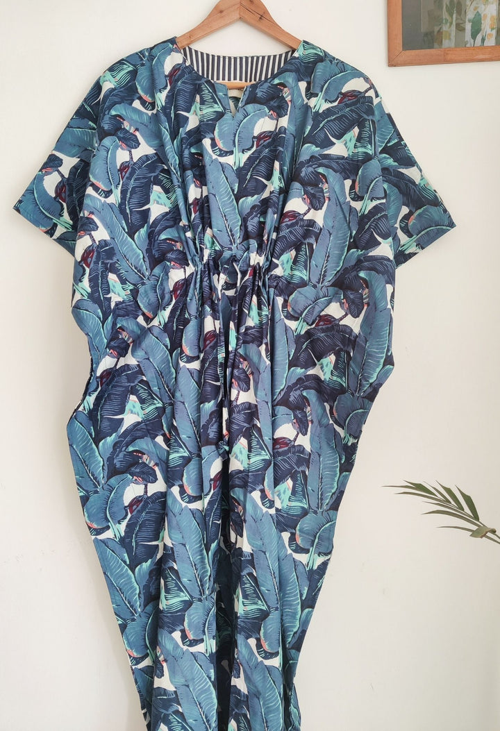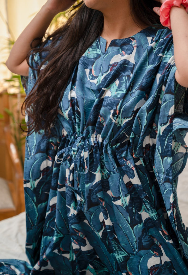 This free-size & flowy Kaftan is crafted in the softest cotton fabric and comes with a drawstring detailing which adds an element of comfort.