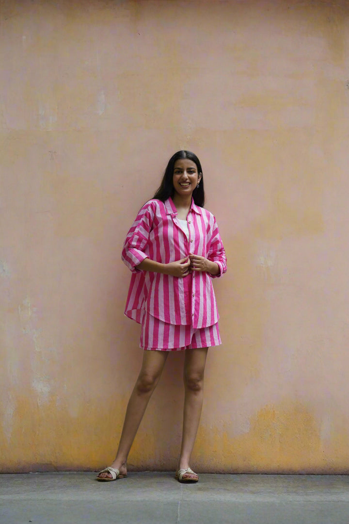 - An oversized button-down shirt with bold pink and white vertical stripes. The sleeves are rolled up to the elbows for a relaxed look.