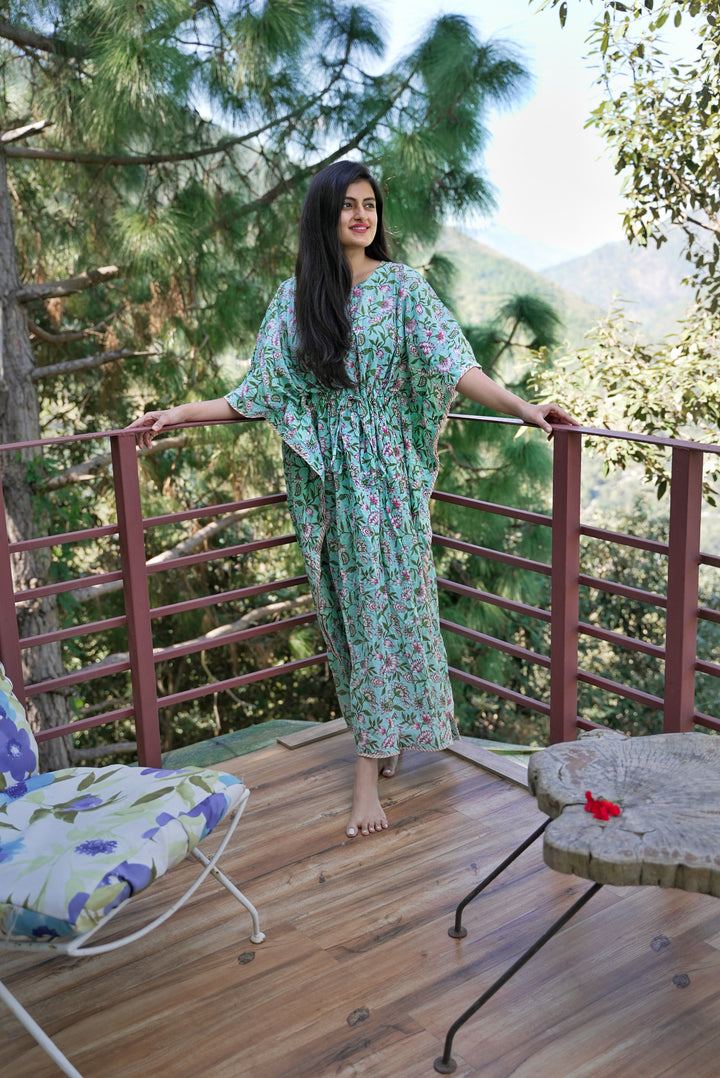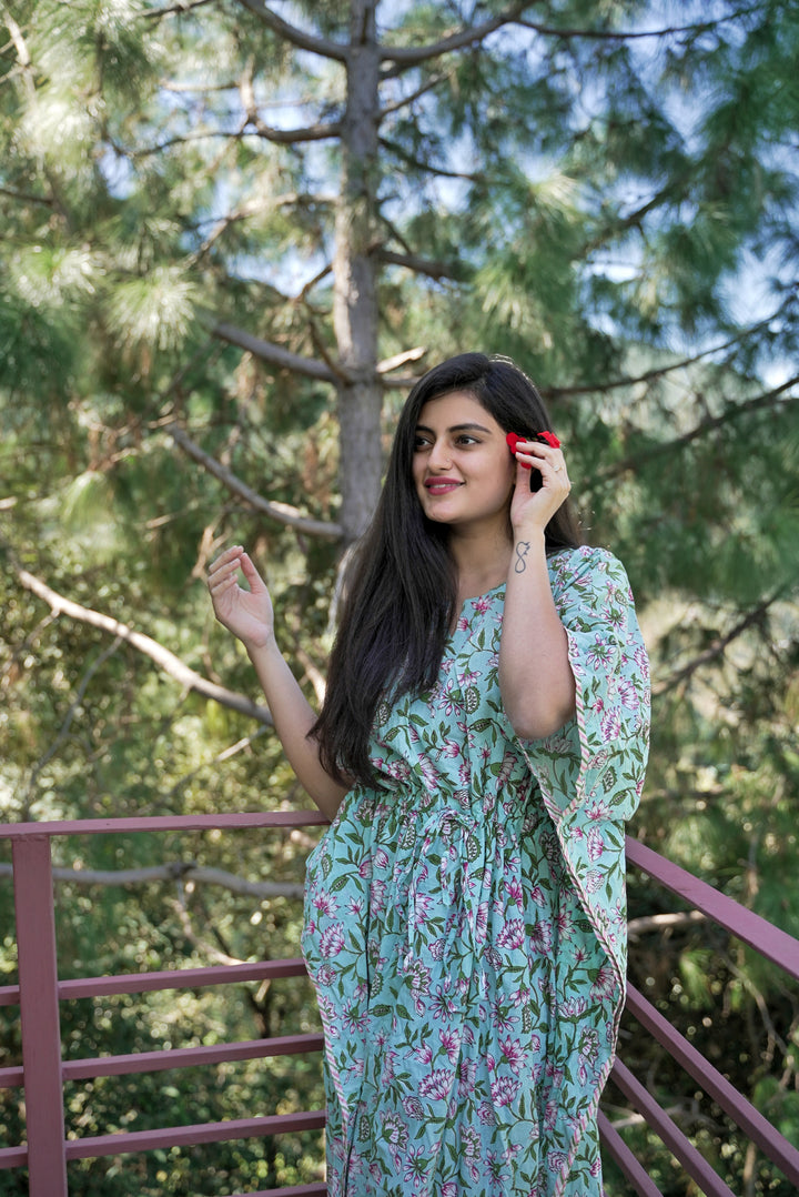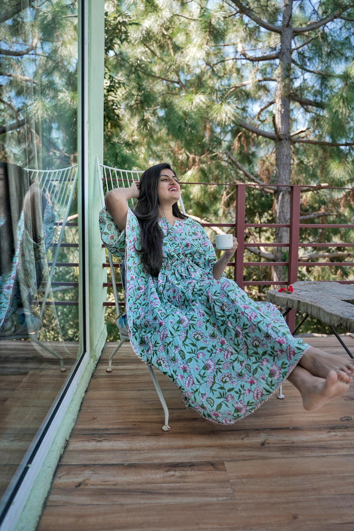 Inhale Exhale, and just like a lotus, bloom out of the darkness and radiate into the world. Look dreamy, feel cozy and stay comfy in this gorgeous aqua blue color kaftan with pink lotus printed all over. Just what you need for your staycations.