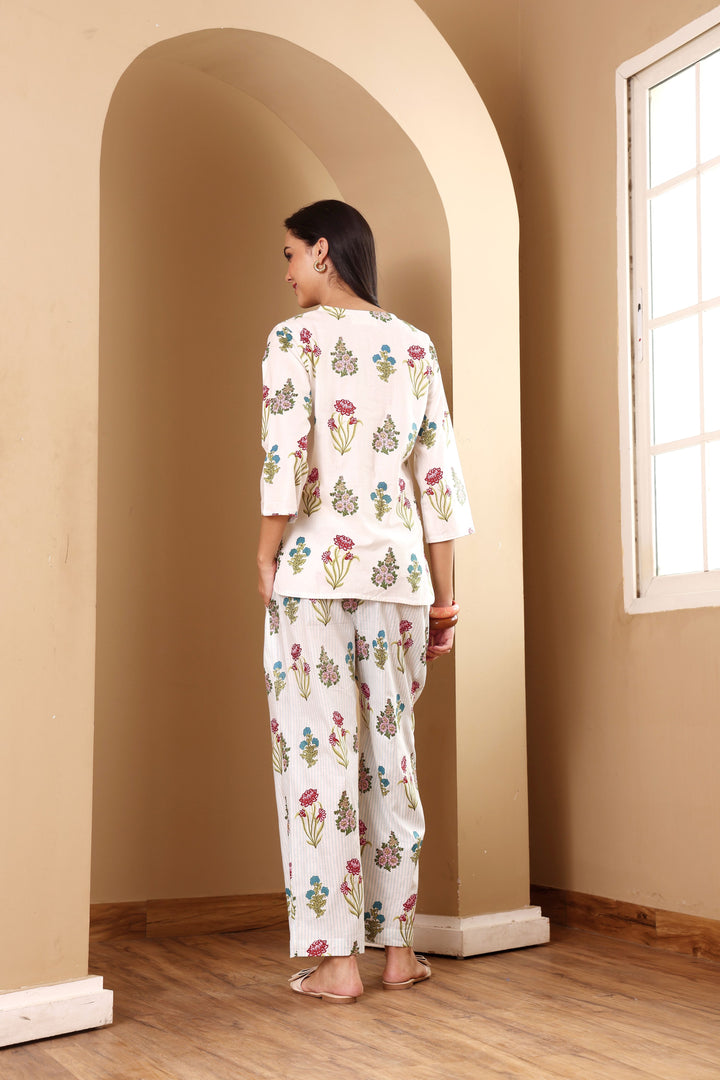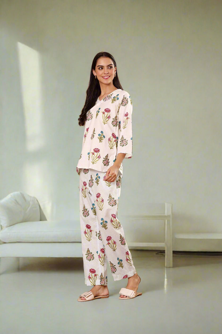 Enjoy cozy comfort with this charming pajama set featuring a white top adorned with a delicate flower bunch print and matching calm blue striped pants. Perfectly soft for bedtime and easygoing for daytime lounging.