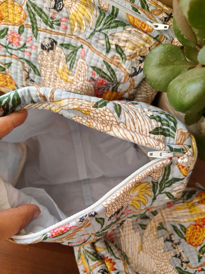 Our cotton fabric cosmetic pouches make for fun travel packs!