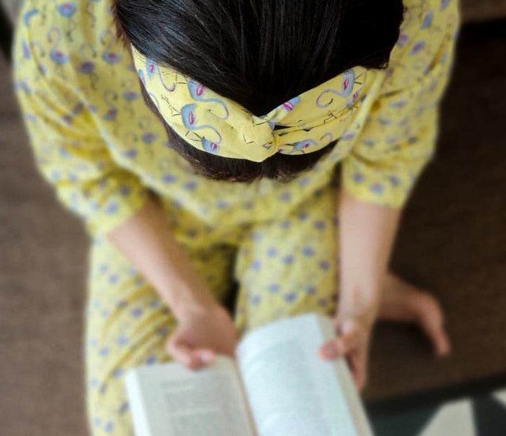Cozy up like in this cutest flamingo print pajama set in yellow base color. Comes with a cool matching headband.